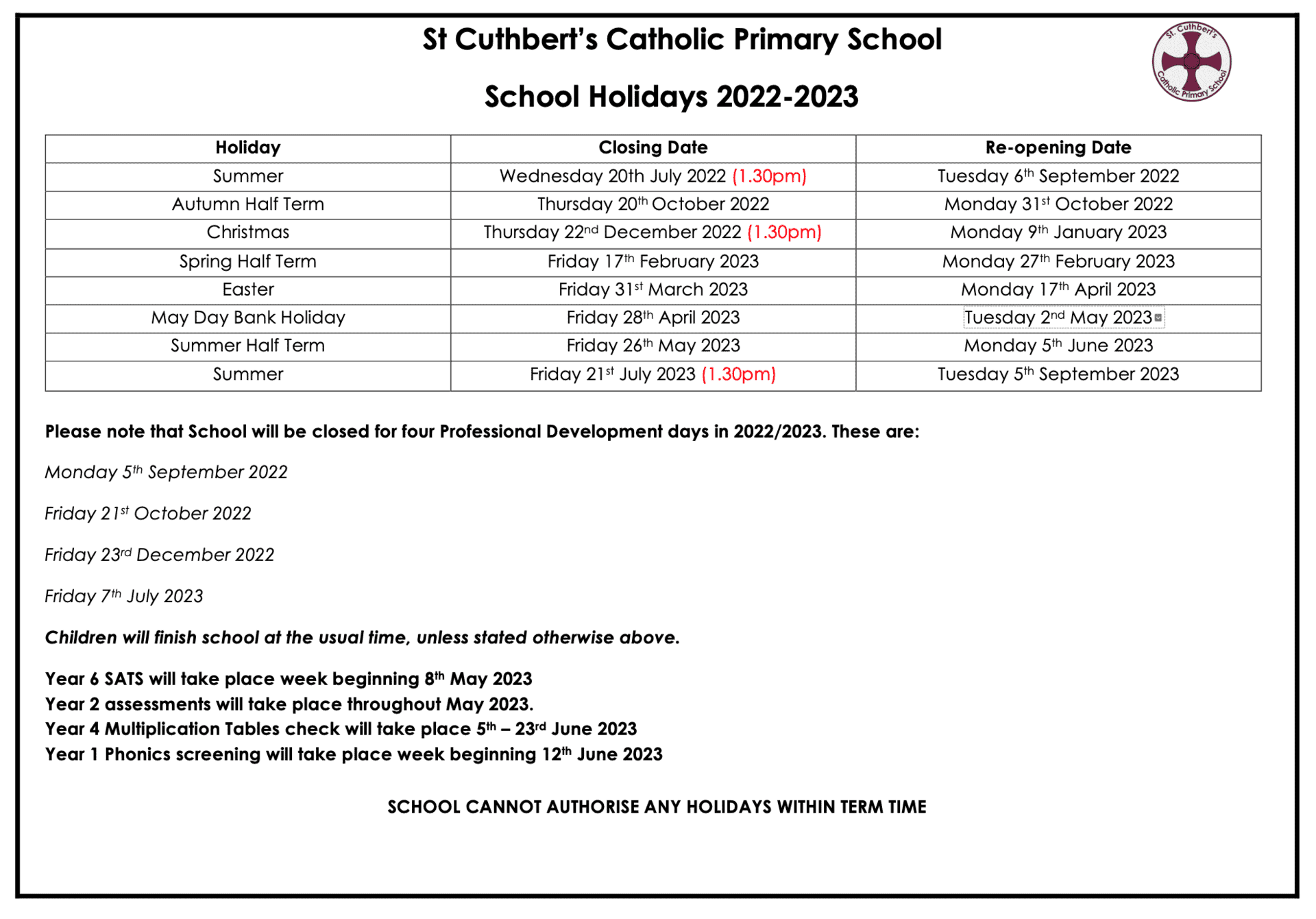 Details Of The Updated School Holiday Calendar With Key Information On When Lessons.